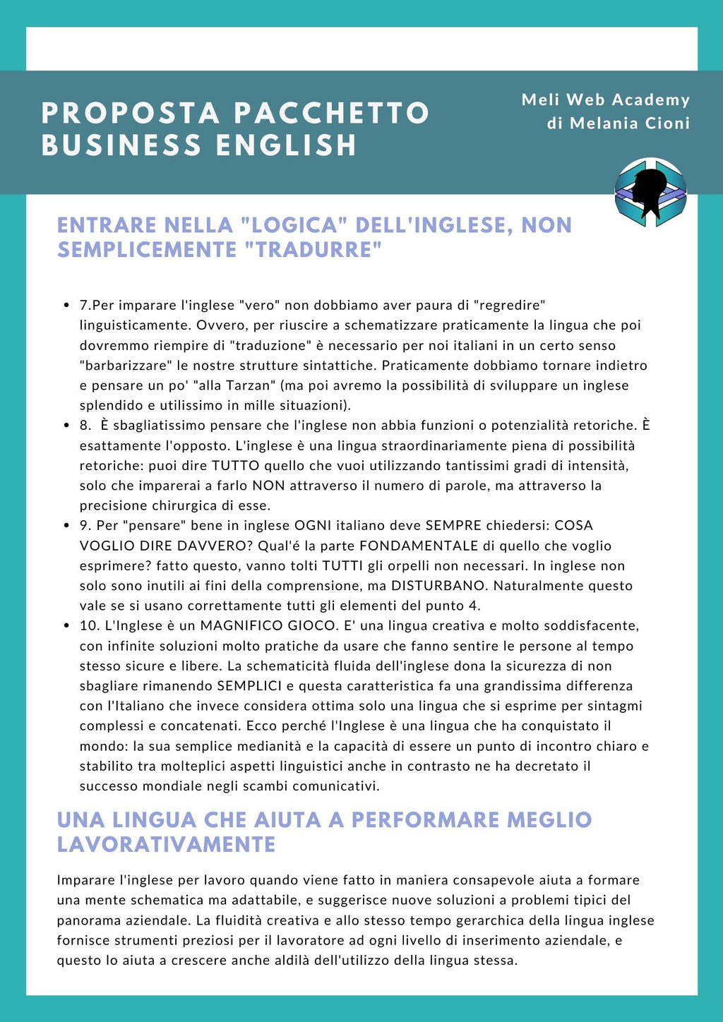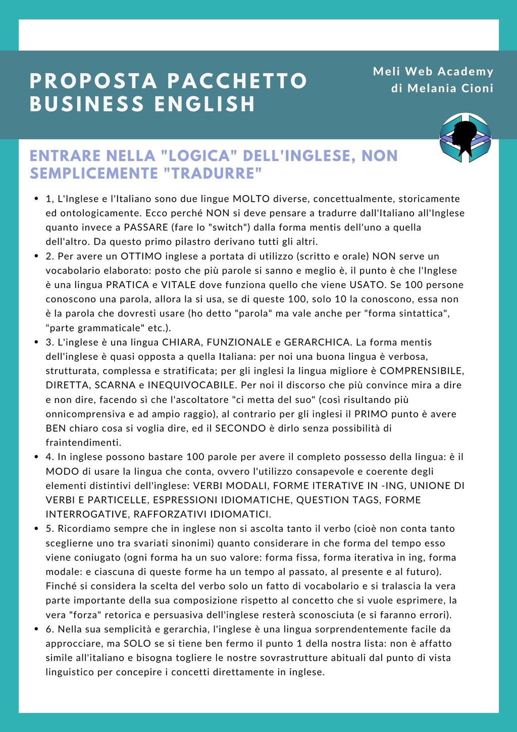 Il metodo Meli Web Academy fornisce - come vedete nel dettaglio a fianco - gli elementi per comprendere la diversa logica idiomatica della lingua inglese. Questa nuova consapevolezza facilita e di molto l'apprendimento e la fruizione di ciò che si è imparato poiché ci si ritrova alle prese con una lingua semplificante e logicamente diretta che NON è così complicato praticare.